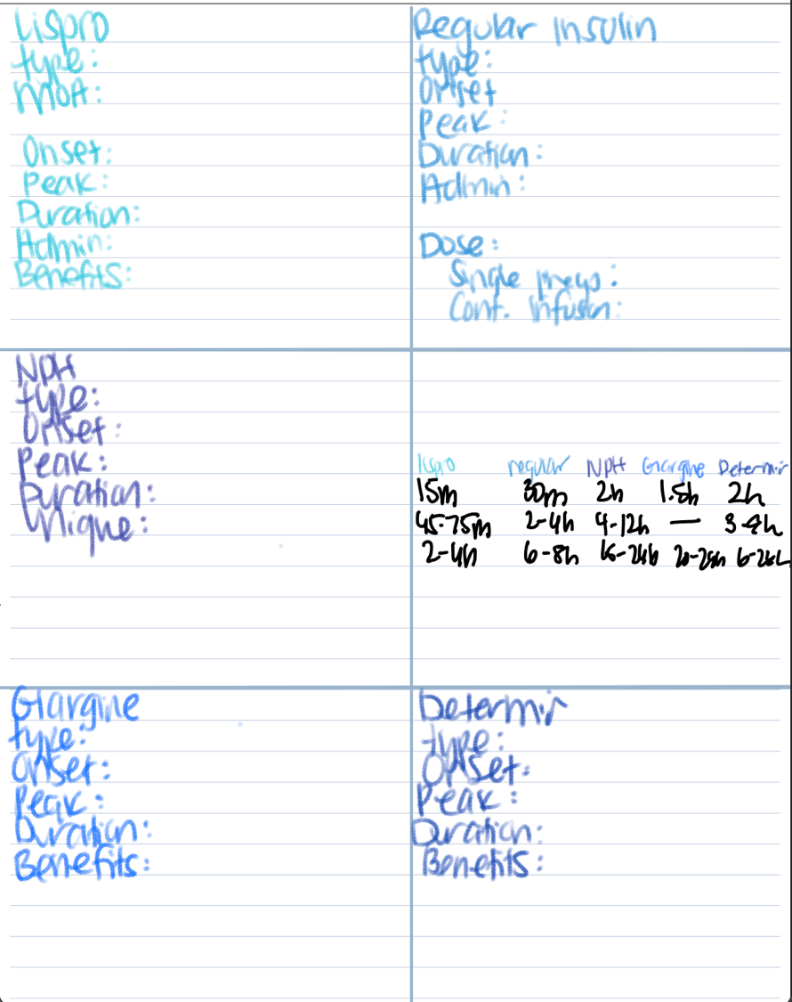 | 7-8p | Pharm: Create tables/cheat sheets for comparison | POA: Create tables/cheat sheets for comparison | Pharm: Quiz yourself on tables/cheat sheets |